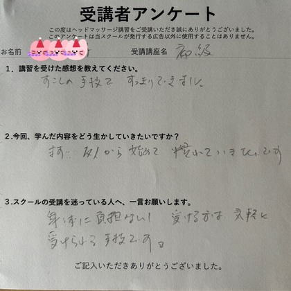 技術の習得も早くて、小柄なのにしっかり心地いい圧で施術できていて、経験者では?と思うくらいでした。