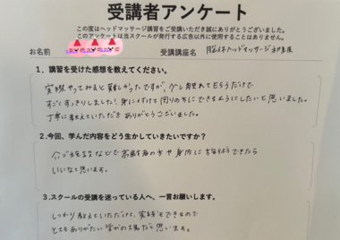 その一つとして、ヘッドマッサージも取り入れたいと受講されました。