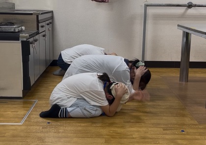 今の小学生はこのポーズで避難訓練をしているそうで、娘にとっては常識。